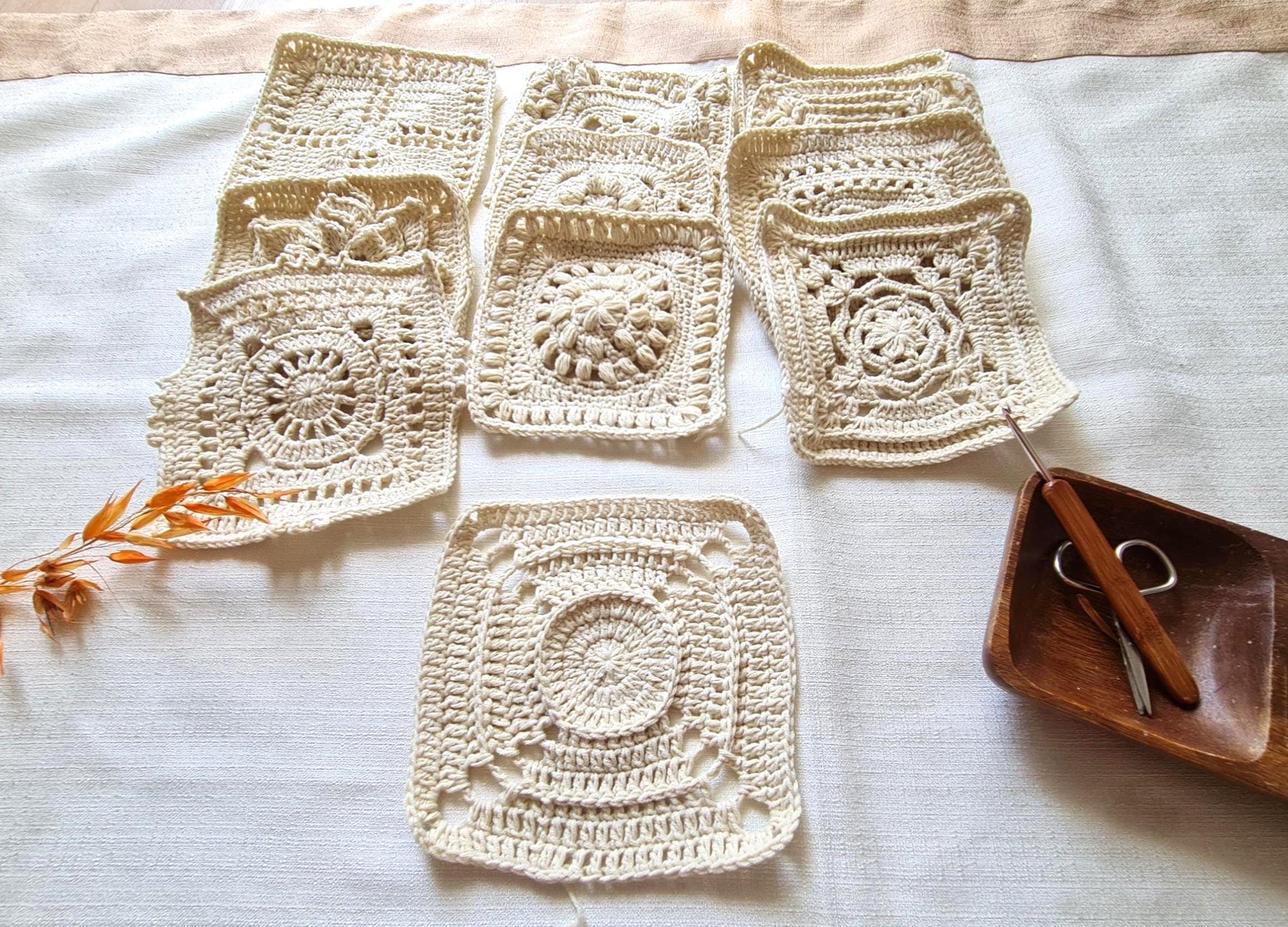 Create stunning handmade projects with this original set of **11 beautifully designed crochet square motifs**. Each motif is thoughtfully crafted to blend classic inspiration with a modern twist – perfect for **blankets, bags, garments, pillows, wall hangings**, and more.